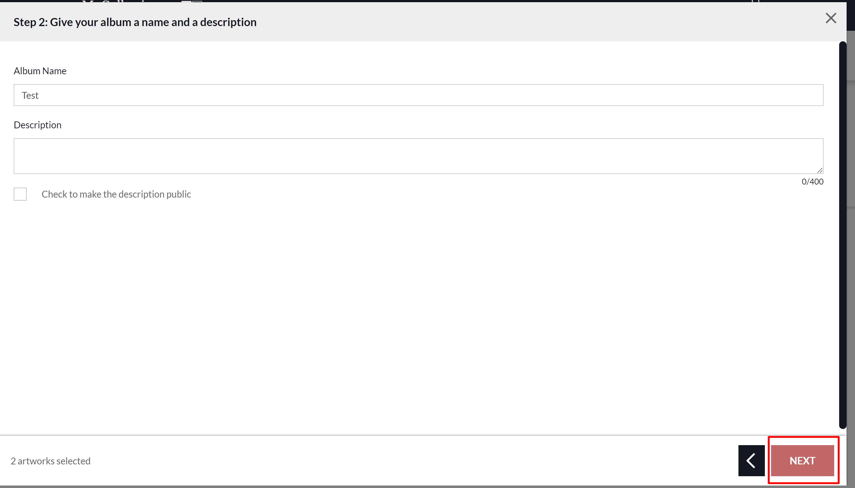 4. On the next screen, you can make changes to the album name and description or just click "Next"