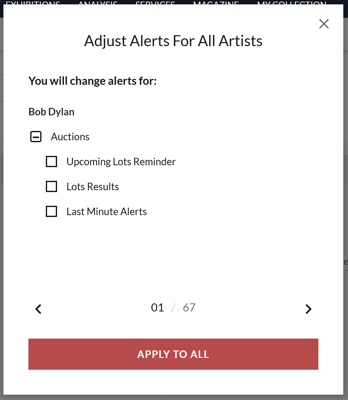 You have the option to further customize your alerts by selecting the specific type of artwork medium for which you wish to receive notifications. For instance, if your interest lies solely in paintings, you may deselect all other media, leaving only "Painting" selected.